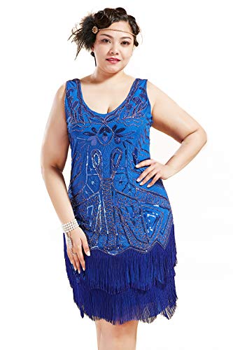 BABEYOND Women’s Plus Size Flapper Dresses 1920s V Neck Beaded Fringed Great Gatsby Dress Blue