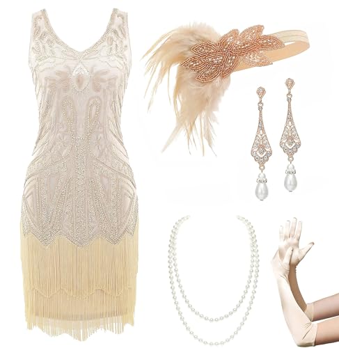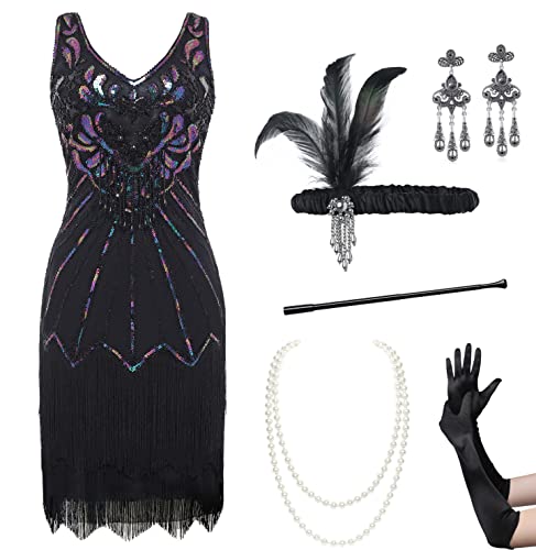 BABEYOND Women’s Flapper Dresses Set 1920s V Neck Beaded Fringed Great Gatsby Dress with Accessories Set