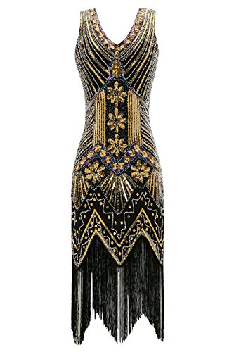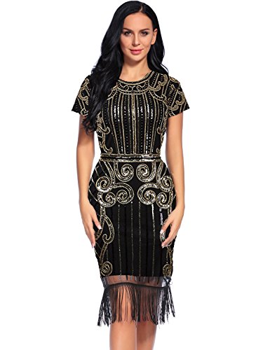 Metme Women’s Flapper Dress 1920s V Neck Beaded Fringed Roaring 20s Sequins Dress Black Gold
