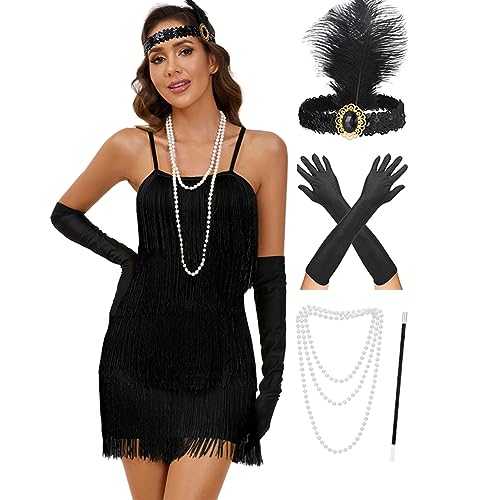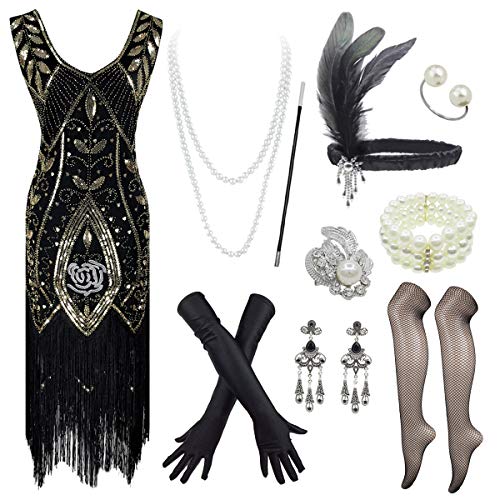 PLULON 1920s Sequin Beaded Fringed Flapper Dress with 20s Accessories Set(Black and Gold,Medium)