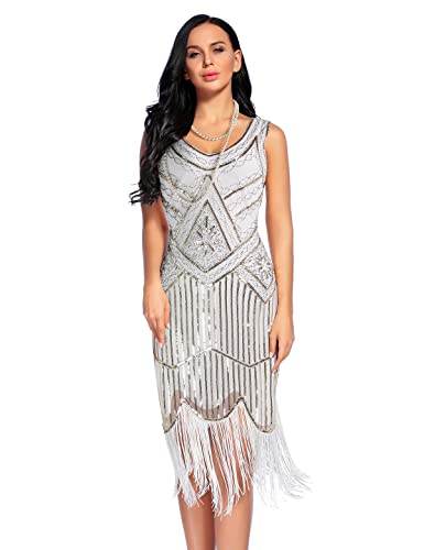 Plus Size 1920s Vintage Fringed Gatsby Sequin Beaded Tassels Hem Flapper Dress for Women (White, Large) White Flapper Dress for Women