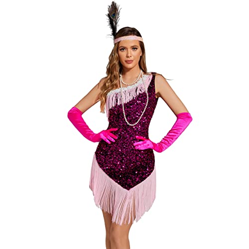 PLULON 1920s Sequin Beaded Fringed Flapper Dress with 20s Accessories Set(Dark Red,Large)