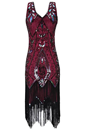 Metme Women’s 1920s Vintage Flapper Fringe Beaded Great Gatsby Party Dress, Wine, Small