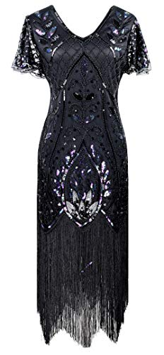 Women’s 1920s Gatsby Inspired Sequin Beads Fringe Flapper Cocktail Roarings 20s Dress (S/US 4-6, Black Black)
