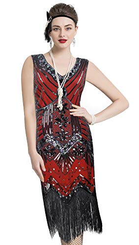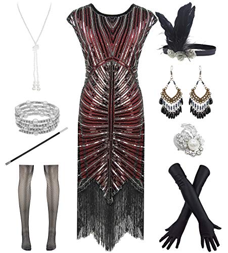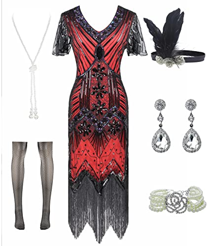 Women 1920s Plus V-Neck Sequin Art Deco Flapper Dress with 20s Gatsby Accessories Set (Small, Style Vintage Black Red)