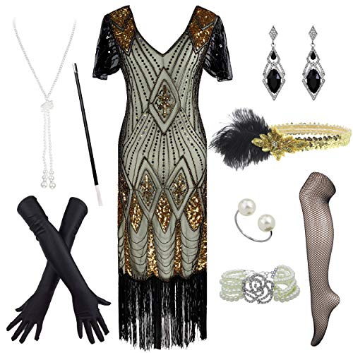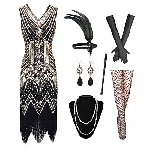 Women’s 1920s V Neck Beaded Fringed Gatsby Theme Flapper Dress with Accessories Set (Medium, Black&Gold)