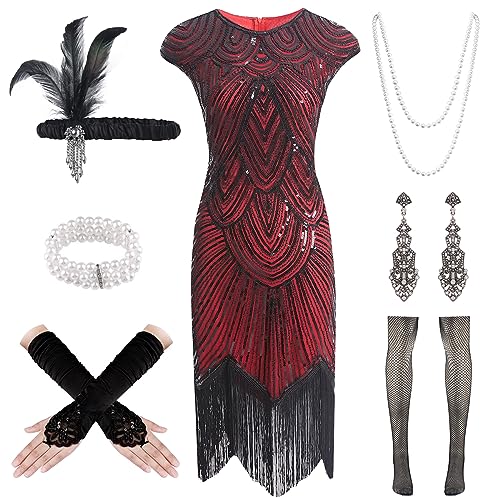 WILDPARTY 1920s Women Flapper Dresses Gatsby Sequin Dresses Vintage Lace Fringed Cocktail Dress with 20s Accessories Set(Red L)