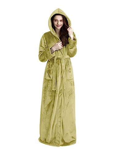 Womens Long Hooded Bathrobe Fleece Full Length Bathrobe with Hood Winter Sleepwear, Olive Green-XL
