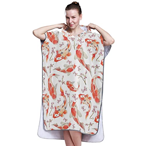 Watercolor Oriental Asian Carps Fish and Cherry Blossoms on White Surf Poncho Changing Robe with Hood Quick-Drying Bathrobe Super Absorbent for Men Women Swim Bath Beach Outdoor Shower Pool