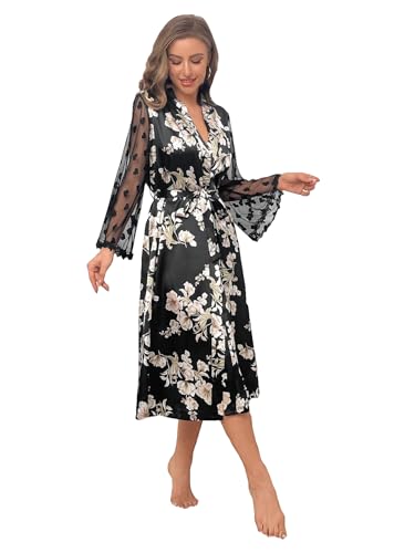 WDIRARA Women’s Floral Print Mesh Long Sleeve Belted Satin Long Robe Bridesmaid Wedding Party Robe Black L