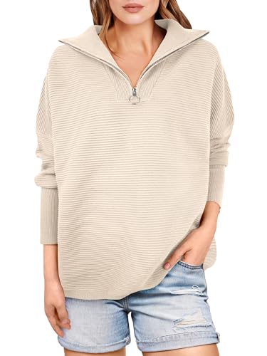 ANRABESS Women’s Oversized Half Zip Sweater Long Sleeve Quarter Zipper V Neck Casual Ribbed Knit Pullover for Teen Girls 2023 Y2K Trendy Fall Outfits Tops Clothes 802kaqi-S Apricot