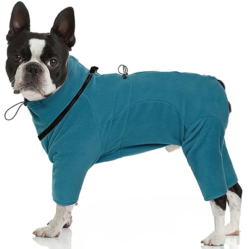 OUOBOB Dog Coat, Warm Dog Coats for Small Dogs, Windproof Polar Fleece Dog Jacket, Winter Cold Weather Vest, Pullover Fleece Pajamas Jumpsuit Onesie, Dog Sweater 4 Legs with Harness Built in Green S
