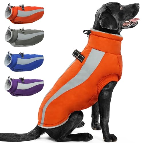 PUMYPOREITY Dog Coats for Large Dogs-XXLarge,Orange-Zipup Dog Coat with Harness,Waterproof Dog Winter Coat Fleece Dog Jacket Zipper,Dog Snowsuit Bordercollie Husky Samoyed GoldenRetriever Rottweiler
