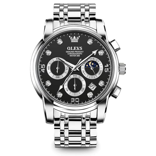 OLEVS Silver Watch Men Big Face Stainless Steel Chronograph Watch for Men with Date Luxury Waterproof Moon Phases Diamond Dial Analog Quartz Dress Watches for Men Black