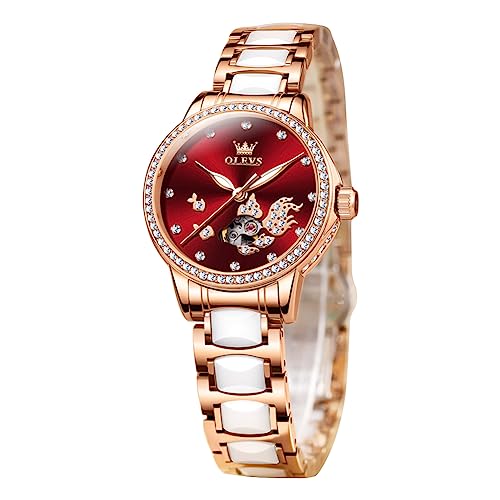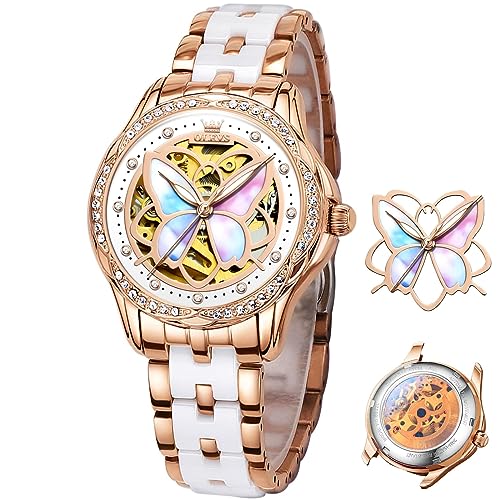 OLEVS Women’s Rose Gold Automatic Watches Skeleton Mechanical Self Winding Ladies Elegant Luxury Dress Butterfly Diamond White Ceramic Band Watch Gift