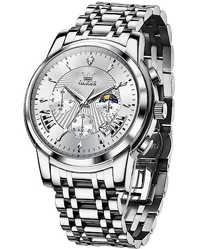 OLEVS Silver Watches for Men Chronograph Stainless Steel Mens Watches Big Face Classic Luxury Men’s Wrist Watches with Date Dress Waterproof Male Watches, Reloj para Hombre