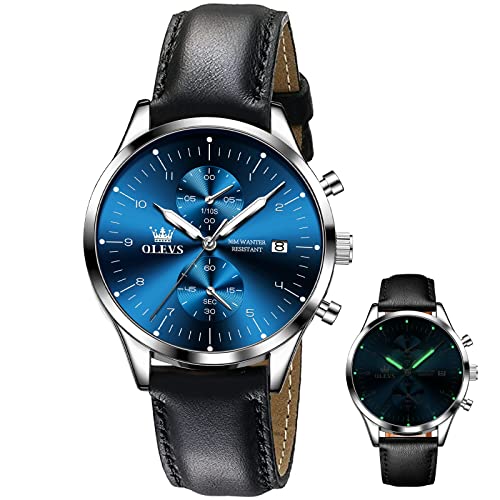 OLEVS Watch Men Dress Leather Band Watches for Men Blue Waterproof Watches with Date Business Stainless Steel Mens Watches Chronograph Multi-Function Quartz Sport Mens Watch Classic Fashion Reloj De Hombre