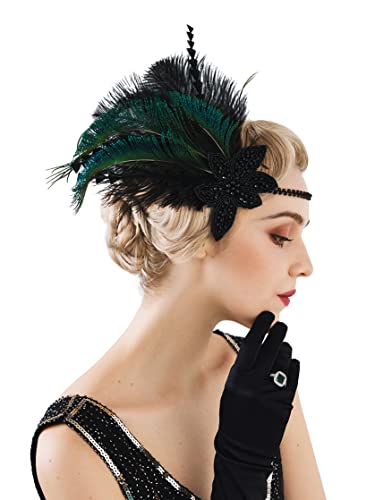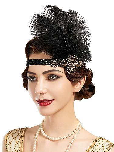 SWEETV Flapper Headbands Womens 1920s Headpiece Great Gatsby Inspired Feather Headband Cocktail Party Rhinestone Hair Accessories for Women, Black