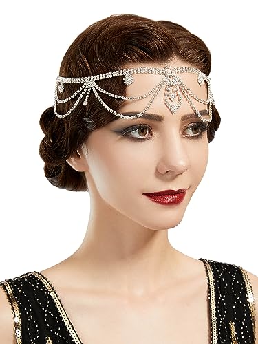 SWEETV Roaring 20s Crystal Rhinestone Head Chain Jewelry Silver Headpiece Hair Accessories for Women