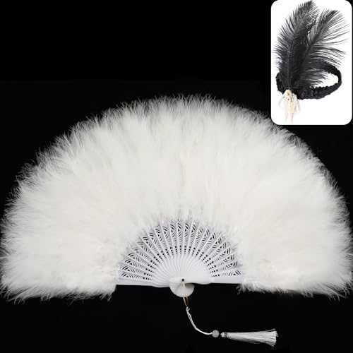 SOGUGOM White Feather Fan with Headband – Renaissance Fan,Rave Fan,Hand Fan Foldable,Marabou Feather Fan for 1920s Gatsby Party,Clothing Accessories and Party Decorations(Off White)