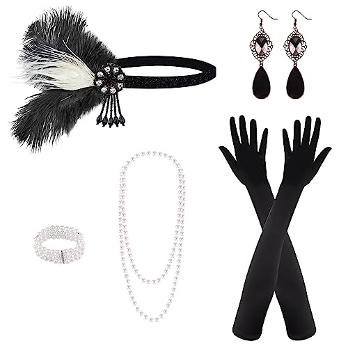 PLULON 7 Pieces 1920s Flapper Great Gatsby Accessories Set Fashion Roaring 20’s Theme Set with Headband Headpiece Long Black Gloves Necklace Earrings for Women(Style 4)