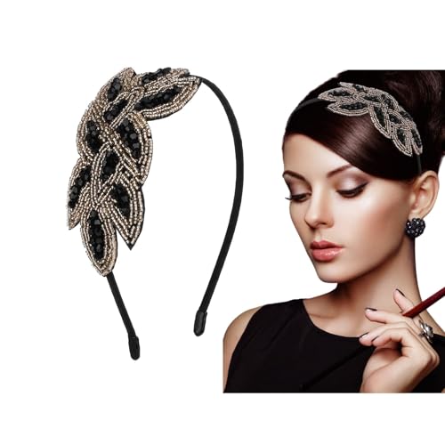 TACPAK 1920s Headbands Black Crystal Hairband Black Rhinestone Flapper Headpiece Vintage Rhinestone Beaded Leaf Hairband Great Gatsby Hair Accessories