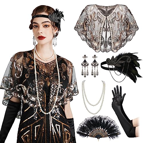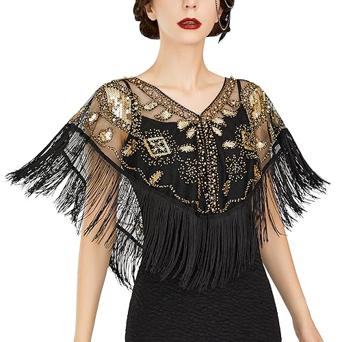 SWEETV Women’s 1920s Shawl Wraps,Sequin Beaded Flapper Evening Shawls for women Formal/Party/Wedding/Formal/Harlem night,Flapper Accessories for Women,Black Gold