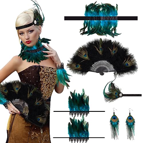 Riceshoot 5 Pcs Peacock Costume Accessories Set Feather Fan 1920s Flapper Headband Feather Cuffs Choker Long Feather Earrings for Women Girls Halloween Cosplay Wedding Party Dancing Show