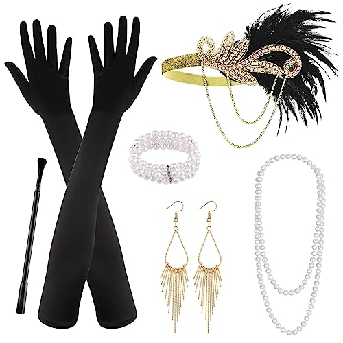 SWEETV 1920s Flapper Accessories Set for Women, Roaring 20s Great Gatsby Headband Flapper Costume Accessories