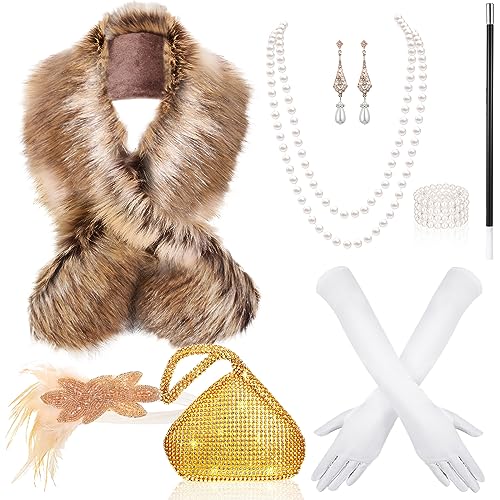 Shinymoon 8 Pcs Halloween 1920s Accessories for Women Fur Shawl Glitter Purse Headband Necklace Earrings Gloves Holder Rod (Brown)