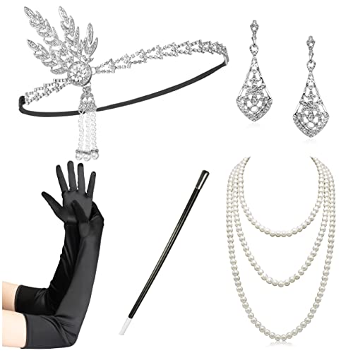 Zivyes 1920s Flapper Accessories Leaf Headband Pearl Necklace Black Gloves Bracelet