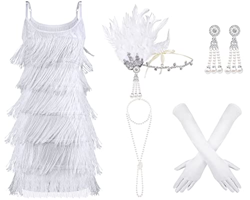 Zhanmai 6 Pcs Halloween Flapper Dress Flapper Costumes for Women 1920s Accessories for Women Costume Accessories Set Headband Pearl Necklace Earrings Gloves Stick (White,Medium)