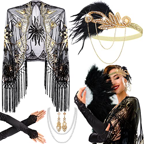 Zhanmai 5 Pcs 1920s Accessories Set Flapper Feather Headband Pearl Necklace Earrings Gloves Fringed Evening Cape Scarf for Women (Elegant Style)