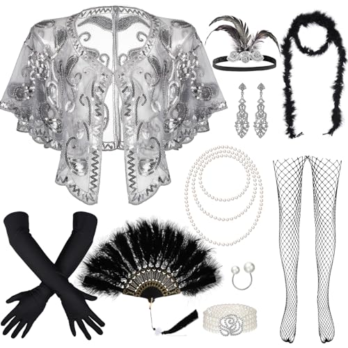 Zhanmai 11 Pieces 1920s Flapper Accessories Costume Set 20s Feather Headband Earring Necklace Shawl Dancing Gloves for Woman (Gray)