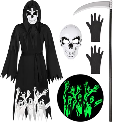 Costumerry Grim Reaper Costume Kids Boys Halloween Costume Glow in the Dark Party Dress Up (10-12 Years)
