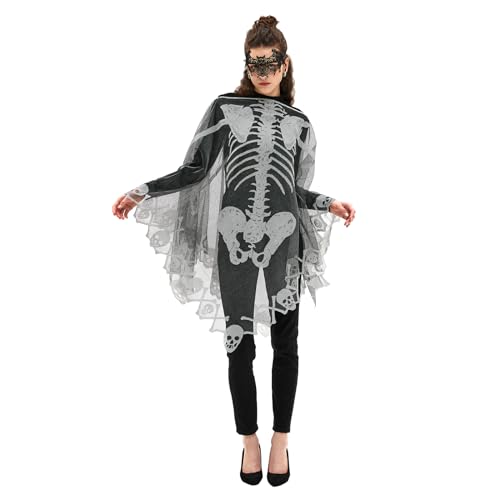 KOFECIT Halloween Skeleton Poncho for Women, Lace Skeleton Cape Shawl, Halloween Costume with Mask