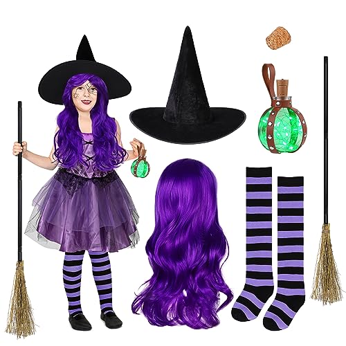 Hiwooii 7 Pieces Kids Halloween Witch Costume Set Girl Long Curly Wig Witch Hat Thigh High Socks Accessories for Children