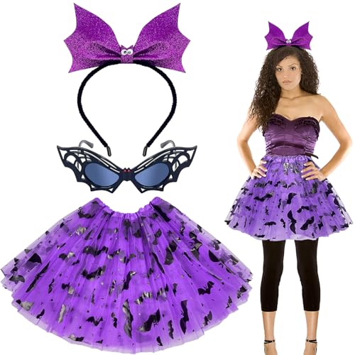 QLINLEAF Halloween Bat Costume Set Bat with Headband and Bat Glasses Tutu Skirt Dress up Halloween Purple Bat Costume Tutu Skirt