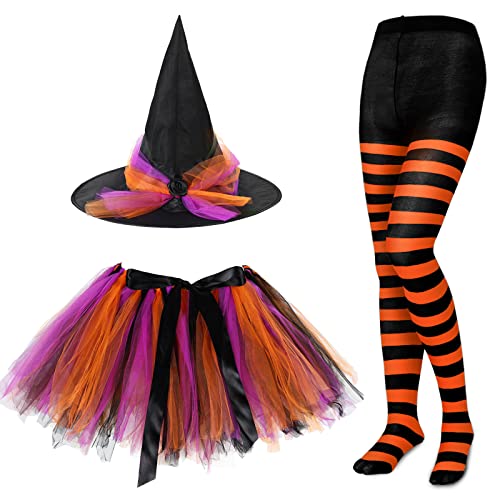 SATINIOR Halloween Tutu with Witch Hat Witch Costumes for Women Witch Tutu Skirt and Striped Tights for Cosplay Costume Party Supplies(Orange Black)