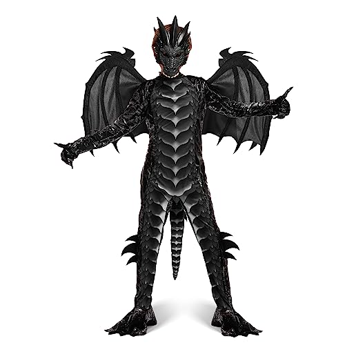 Spooktacular Creations Kids Dragon Costume, Dark Dragon Jumpsuit, Boys Dragon Wings, Tail and Mask Set for Halloween Dress Up-S