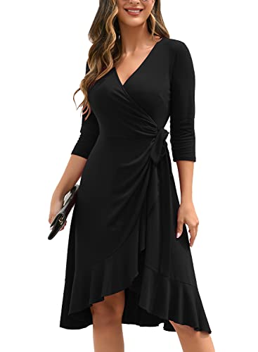 IHOT Women’s Sexy Deep V-Neck 3/4 Sleeve Ruched Belted Casual Nightout Party Wrap High Low Knee Length Cocktail Dress with Ruffles for Work Party,Black,XL