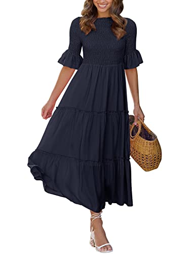 MEROKEETY Women’s Summer Short Sleeve Swiss Dot Smocked Dress High Waist Midi Maxi Dress,Navy,L