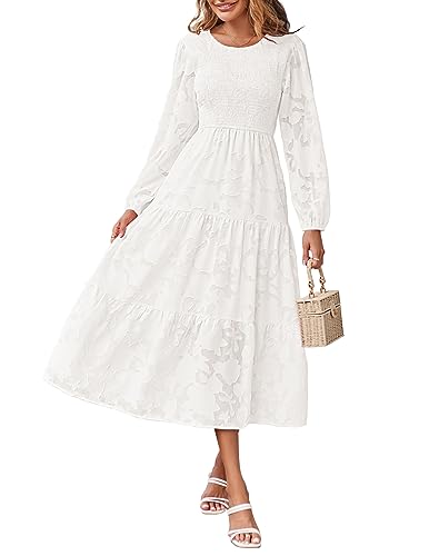 MEROKEETY White Dresses for Women 2023 Fall Long Sleeve Crewneck Floral Textured Midi Dress,White,M