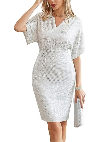Ladies Sparkly Formal Dress Glitter Short Sleeve V Neck Midi Cocktail Dress for Women Evening Party White 2XL