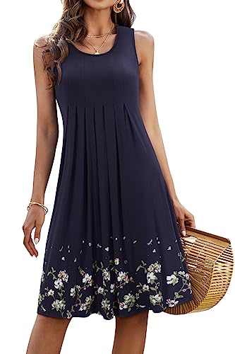 KILIG Women Sundress Summer Casual Dresses Loose Print Pleated Sleeveless Midi Vest Dresses for Beach Wedding Party(Navy,XL)