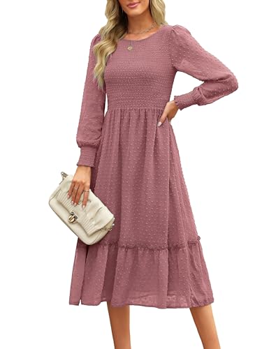 Maggeer Fall Long Sleeve Dress for Women 2023 Women’s A Line Swiss Dot Wedding Guest Engagement Work Ladies Smocked Midi Causal Dresses Mauve L