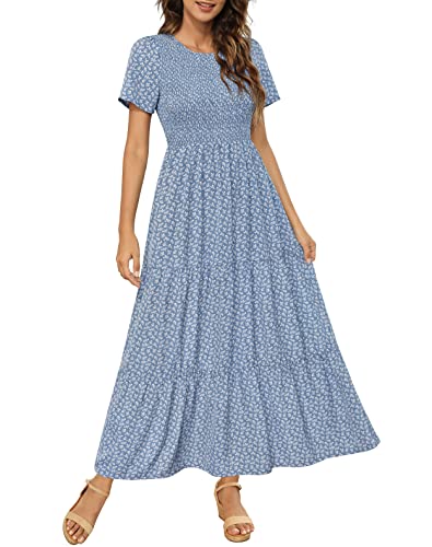 Maggeer 2023 Womens Maxi Dress Modest Smocked Tiered Floral Short Sleeve Dress for Women Blue XL