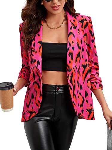 Verdusa Women’s Leopard Print Ruched 3/4 Sleeve Shawl Collar Blazer Jacket Hot Pink M