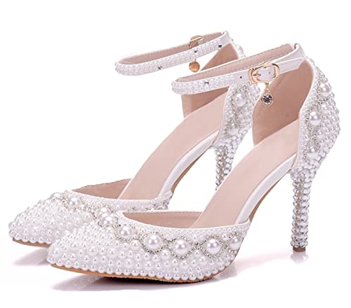BestopBridal Fashion Sandals Shoes Designer Women Wedding Shoes Pearls Rhinestones High Heels Shoes For Bride White Size 7.5