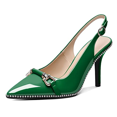 AUMOTED Women Green Slingback Shoes Stiletto High Heels Pointed Toe Beaded Pumps Dress Shoes for Wedding 3.5 Inch Patent Green US Size 7
